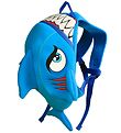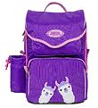 The Jeva school backpack consists primarily of one large zipper compartment, which has a detachable key ring strap. On the front of the backpack, there is a zipper pocket for small items and an insulated lunch box compartment. At the top, the backpack has a flap closure with velcro, with a name tag on the inside.