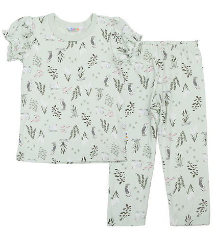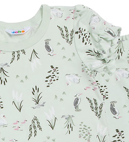 Cute Joha pyjama set consisting of a t-shirt and a pair of trousers. The T-shirt and trousers are in a light green shade, with a print of animals and plants.