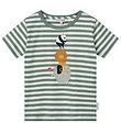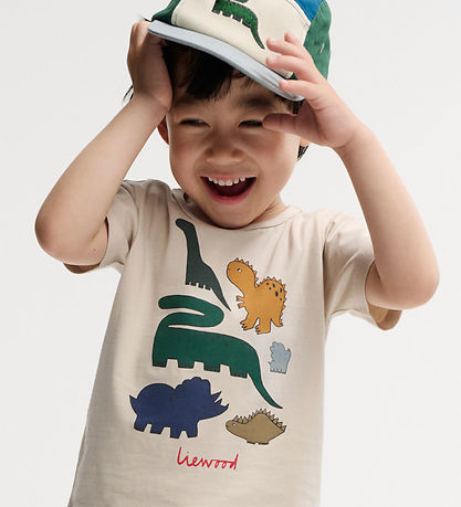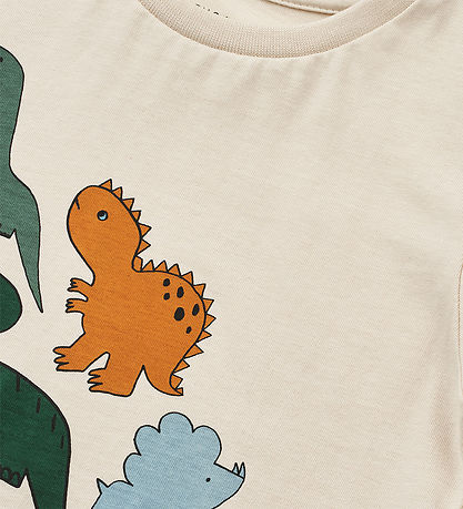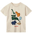 Charming Liewood t-shirt in beige with short sleeves and a colorful dinosaur print on the front. The Liewood t-shirt combines fun and style with its lively design.