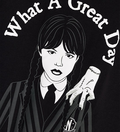 Smart LMTD hoodie in black with print of the text "Wednesday" in white on the front. On the back there is a print of the characters Wednesday and Thing from the Netflix series Wednesday as well as the text "What A Great Day" in black, grey and white.