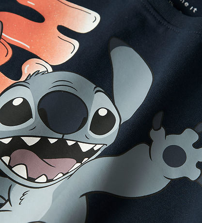 Charming Name It blouse with long sleeves in navy. The blouse has a large print of Stitch on a skateboard on the front, which adds a fun and lively element. The Blouse has a round neckline, which gives a simple and clean design.