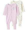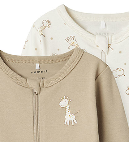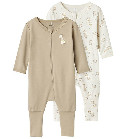 Nice Name It nightsuits sold in a 2-Pack in off white and beige. One nightsuit has an all over print of small giraffes and the other has a simple giraffe in the left corner. The Nightsuits have long sleeves and practical zips that make dressing quick and easy.