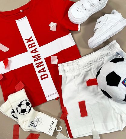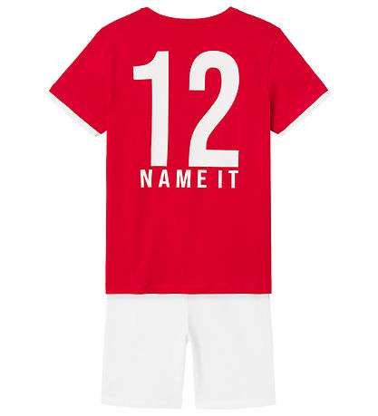 - The T-shirt is red with a large print of Dannebrog and the text "Denmark" on the front. On the back there is a large white print of "12 Name It".