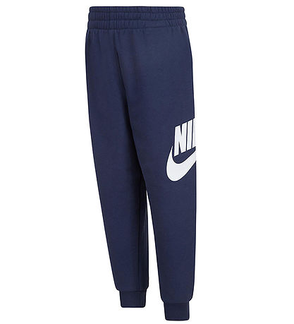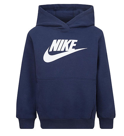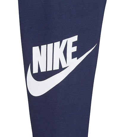 Lovely Nike sweat set, which consists of a hoodie and a pair of sweatpants in navy, and on the front of the hoodie and in the middle of the left trouser leg, a large, white logo is printed.