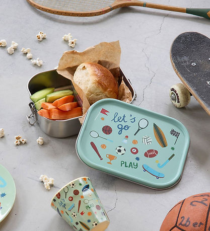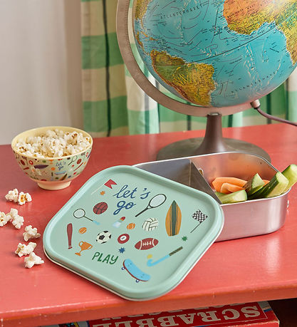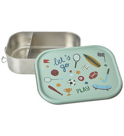 Beautiful Rice lunchbox in stainless steel, and the lid is dusty green with a print of various cool sports motifs.