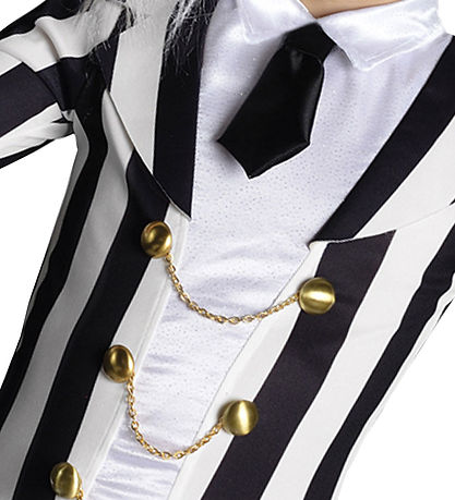Smart Rubies costume of Beetlejuice from Beetlejuice. The outfit consists of a dress in black and white with a black tie and fine gold details and white glitter.