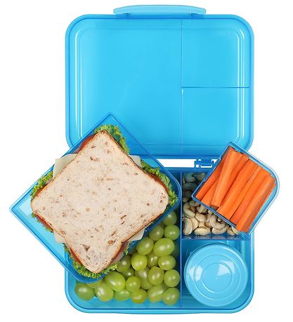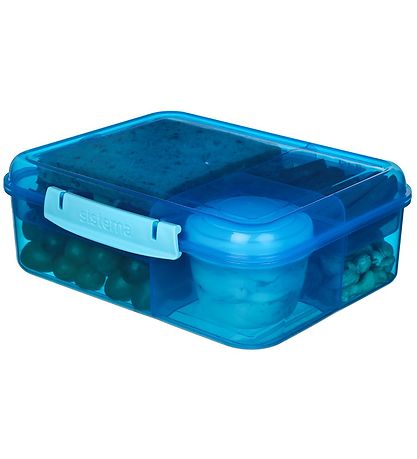 Delicious Sistema lunchbox in blue plastic, which has a maximum capacity of 1.65 l. Also included is a little, round container with a blue lid, which has a maximum capacity of 150 mL.