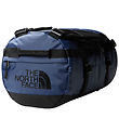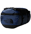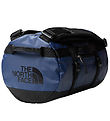 Cool The North Face travel bag in navy blue with black straps and details, and at the ends it says "The North Face" in black letters. The travel bag is made of a strong, coated, waterproof material, and the bottom is black and made of a durable quality.