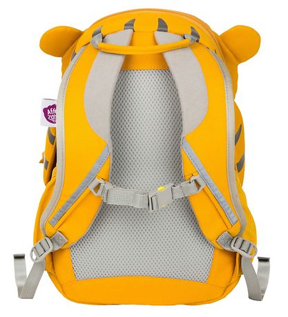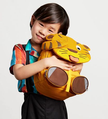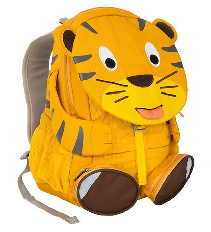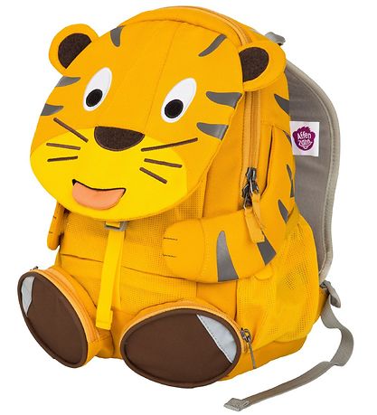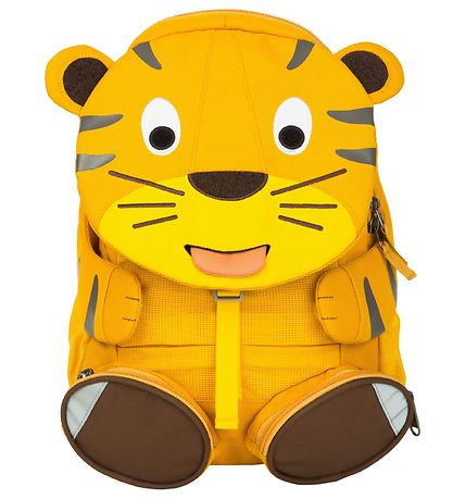 Fine Affenzahn backpack in yellow shades shaped like a tiger. At the front there are two eyes in white and black as well as a pink tongue. The tongue is attached with an elastic band, so when you pull on it, a name tag appears. On the tiger's brown feet there are reflexes.