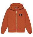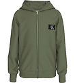 Practical Calvin Klein cardigan in a dusty dark blue colour with zipper and hood. On the back is a large Calvin Klein logo in black and white checs.
