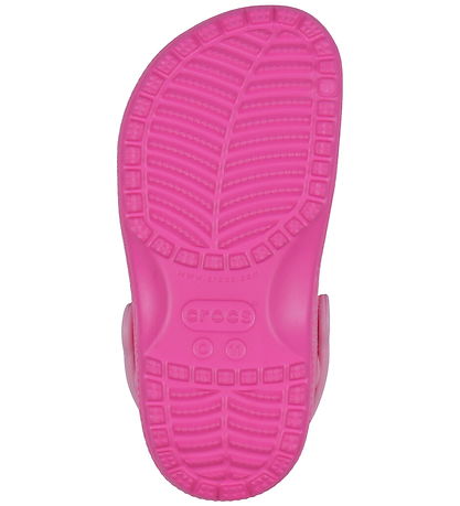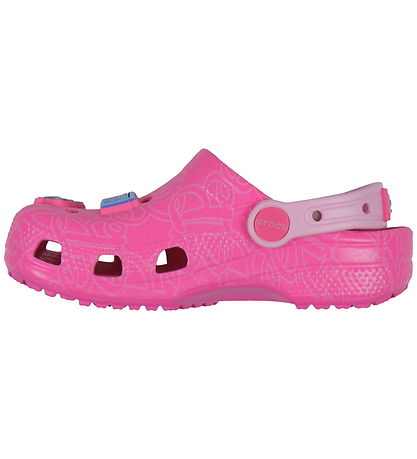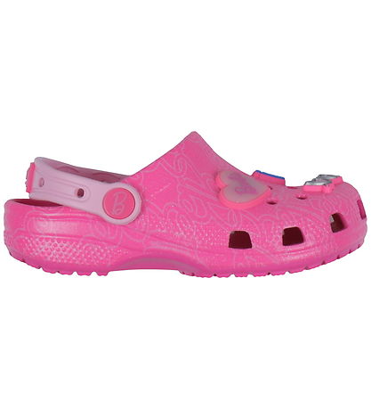 Stylish Crocs sandals in pink glitter with pink Barbie print and Barbie applications.