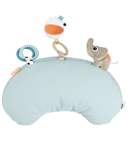 The Done by Deer cushion with activity toy is perfect for when the kid needs to lie on their stomach and practice looking up, as the activity toys are fun to explore. There are three different pieces of activity toy that stimulate the senses with sounds such as bells and crackling paper, and which can be bitten into and explored with the hands.