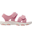 The Sandals have an open toe. They close with two Velcro straps: one over the foot and one in front of the ankle. The Sandals have a white and grey, flexible outer sole with a good slip pattern.
