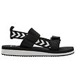 Cool Hummel sandals in a mirror-bright silver color of imitation leather with a white logo on the ankle strap.