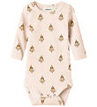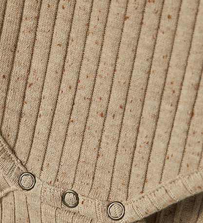Elegant Lil' Atelier bodysuit in a melange beige shade with a classic ribbed pattern. The design is simple and stylish with two decorative buttons at the front that add a subtle touch. Lil' Atelier's bodysuit has long sleeves and a light knitted structure. The Bodysuit is easily closed with practical push buttons at the left shoulder and between the legs.