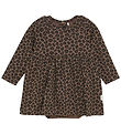 Lovely Minymo bodysuit in brown with ribbed structure. The Bodysuit has a round neckline with two buttons at the front. It has long sleeves with wide ribbed edges. The Bodysuit closes with push buttons between the legs and can be adjusted in length so that it can be used for a longer period of time.