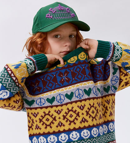 Beautiful Molo blouse with colorful, motif-filled stripes in shades of green, yellow, blue, bordeaux, grey and white.