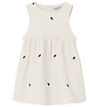 The Name It dress has a round neckline and armholes with narrow edges and closes at the stud closure at the back with three decorative buttons in a wooden look. The Dress is cut below the bust, which gives a skirt with good width and fine wrinkles, and the dress is made in a light and tightly woven cotton quality.