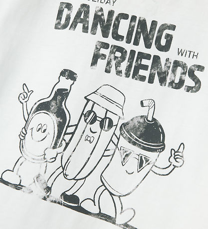 Nice Name It t-shirt in white, with black prints with a washed look, consisting of a smaller text print on the left chest and a larger print on the back with text and fun, dancing toy figurine.