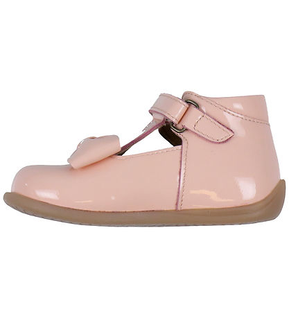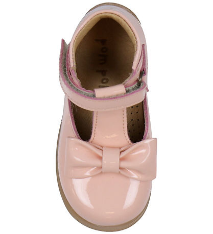 Cute Pom Pom shoes in pink patent leather with a large bow on both feet.