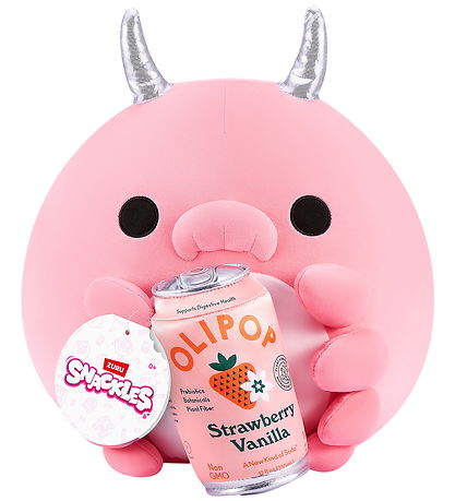 Fine Snackles soft toy in the shape of the sea urchin Millie in pink. The Soft toy is shaped like a round cushion with metallic spikes, small feet and an embroidered face, and the soft toy is holding an Ollipop strawberry vanilla.