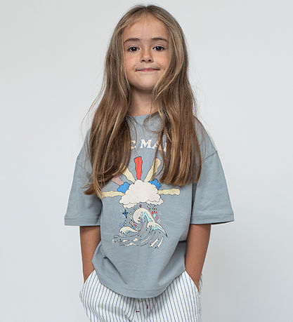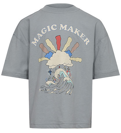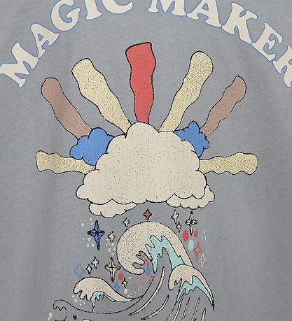 Beautiful Sofie Schnoor t-shirt in dusty blue, with a print on the front of a cloud over a wave in different shades, with the text "Magic Maker".