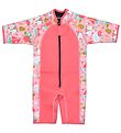 Beautiful Splash About wetsuit in pink with a nice print of strawberry in beautiful colours on the sleeves and along the sides. On the chest is also a colorful print.