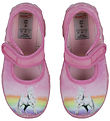 Adorable Superfit slippers in pink wool felt, with embroidered hearts over the toes and a single on the velcro strap. On the back, "Superfit" is embroidered in pink and the outsole is pink.