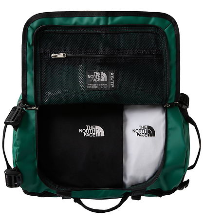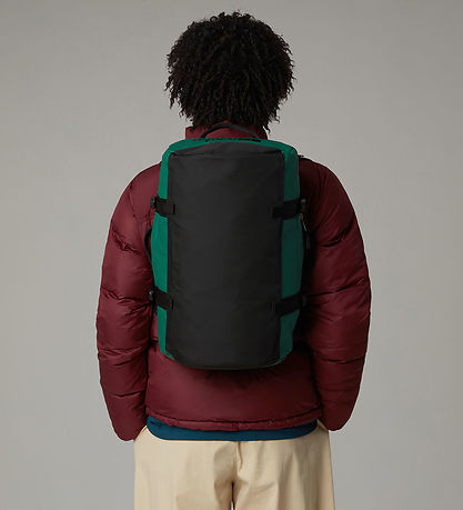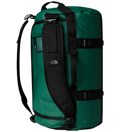 Smart The North Face travel bag in green with black straps and details, and at the ends it says "The North Face" in black letters. The travel bag is made of a strong, coated, waterproof material, and the bottom is black and made of a durable quality.