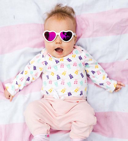 Beautiful Babiators sunglasses in white with heart-shaped, reflective lenses in pink and gold.