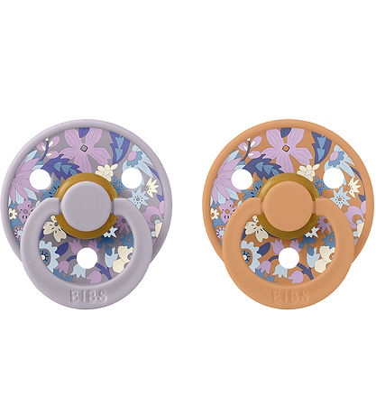 Beautiful BIBS x Liberty pacifiers, sold in a practical 2-Pack in orange and dusty purple with a fine print of blue and purple flowers.