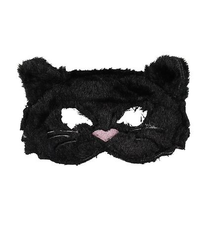 Den Goda Fen mask has a black plys front with holes for the eyes and embroidered details to the front that look like the cat's whiskers and snout. The mask has a felt back with a narrow elastic edge.
