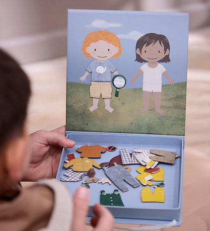 Filibabba the game of large bricks representing clothing, which comes in a smart box, the lid of which opens and becomes the play area with two kids who have to dress up for fairy tale. The lid is a magnetic plate on which the magnetic bricks can be placed, and the box itself can store the pieces.