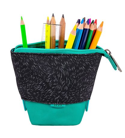 Smart Jeva pencil case in green, with a black set at the top with small lines in white that look like fur.
