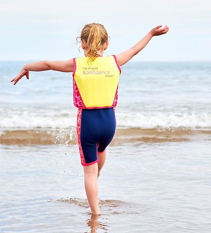 Lovely Konfidence swim vest in pink, fuchsia and dark purple with a leaf pattern and print of Konfidence's well-known dolphin logo on the left chest. It says "The Original Konfidence Jacket" around the back, which is yellow to make the swim vest visible in the water. The Swim vest is made of soft and comfortable neoprene, which is a flexible material that is also used in wetsuits. Neoprene also protects against the sun's UV radiation, while retaining the kid's body heat both in and out of the water.