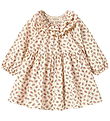 Elegant MarMar dress in beige with a fine floral print in pink, green and blue shades. The MarMar dress has long sleeves and an elastic, round neckline with ruffle details. The dress's light fabric falls fine and creates a classic look.