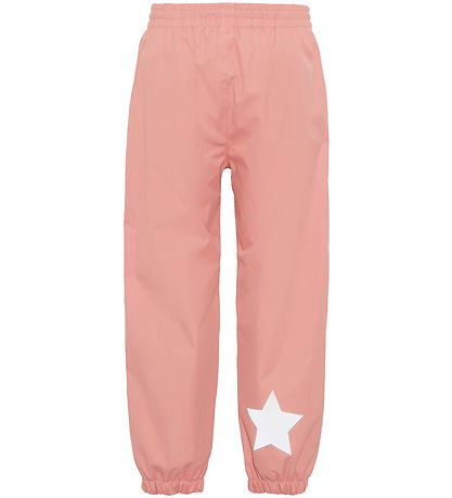 Cool Molo rain pants in pink. The Rain pants are also equipped with a large, reflective Molo star on the back of the right leg.