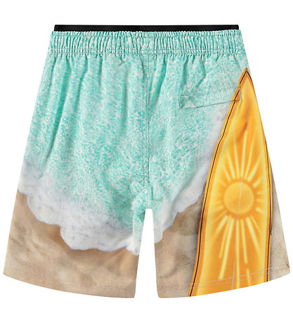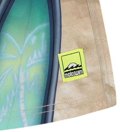 Summery Molo swim shorts in sand and turquoise with a surf print. The swim shorts have a good elastic at the waist that can be adjusted with a lace. There are two pockets at the front and inside there is a net with elastic at the leg openings.