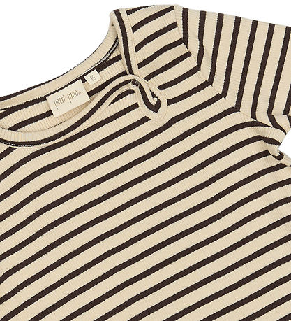 Elegant Petit Piao dress with wide, horizontal stripes in dark brown and cream white. The Dress has long sleeves and a round neckline. The skirt is decorated with a light ruffle edge, which gives a refined look.