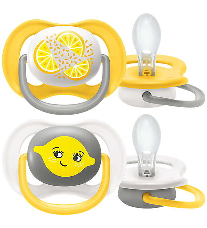 Fun Philips Avent pacifiers sold in a 2-Pack in white and yellow with lemon print.