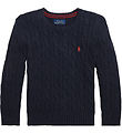 The Polo Ralph Lauren blouse has long sleeves and wide ribbed edges, and it is made of a soft, knitted quality.