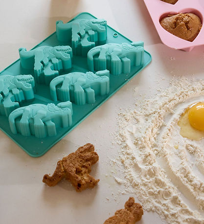 Fun Rice cake mold mint green silicone and with holes shaped like different dinosaurs.