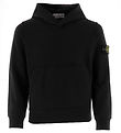 Nice Stone Island hoodie in plain black sweat, and on the top of the left sleeve the iconic logo mark is fixed with buttons.
