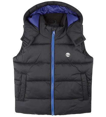 Lovely Timberland puffer vest in black with horizontal stitching and a little white logo print on the left chest. The zipper and hood lining of the quilted vest are blue.