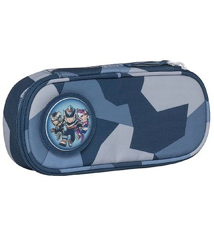 Smart Beckmann pencil case with parts in shades of blue and grey, and on the top side there is a velcro label with three characters wearing cool suits.