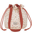 Beautiful Cam Cam Copenhagen project bag in white with a beautiful allover print of berry plants in red and blue. The project bag has a quilted structure and it has red straps and lining.