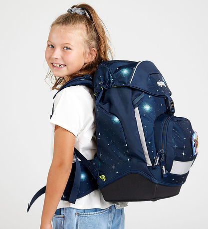 Beautiful Ergobag school backpack in navy with white stars in different sizes and with a space theme. The Bag has two velcro tags with spaceships.