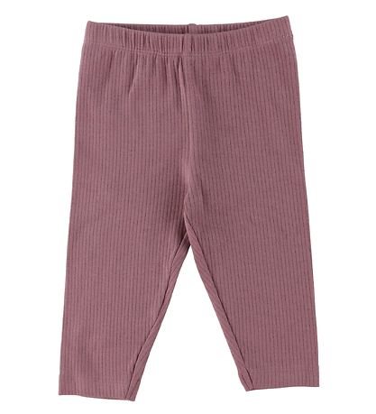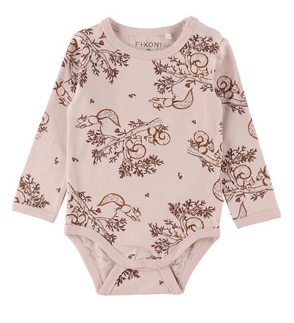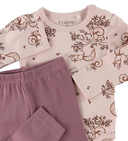 Cute Fixoni set consisting of a bodysuit, a pair of leggings and a teething bib. The Bodysuit is pink powder with a print in brown and purple shades of squirrel sitting in a branch, the leggings are plain dusty purple with rib structure, and pink powder with a little, brown print on the front of small sponge.