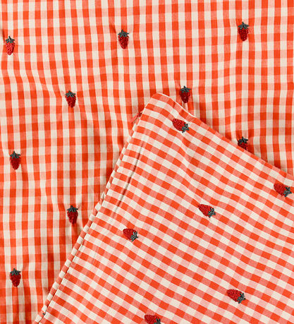 Lovely Flöss bedding with red and beige checs and small, embroidered strawberry.