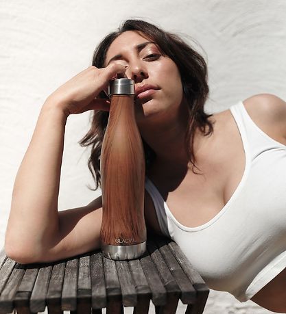 Smart Glacial thermo bottle with a print of brown wood with steel at the top and bottom.